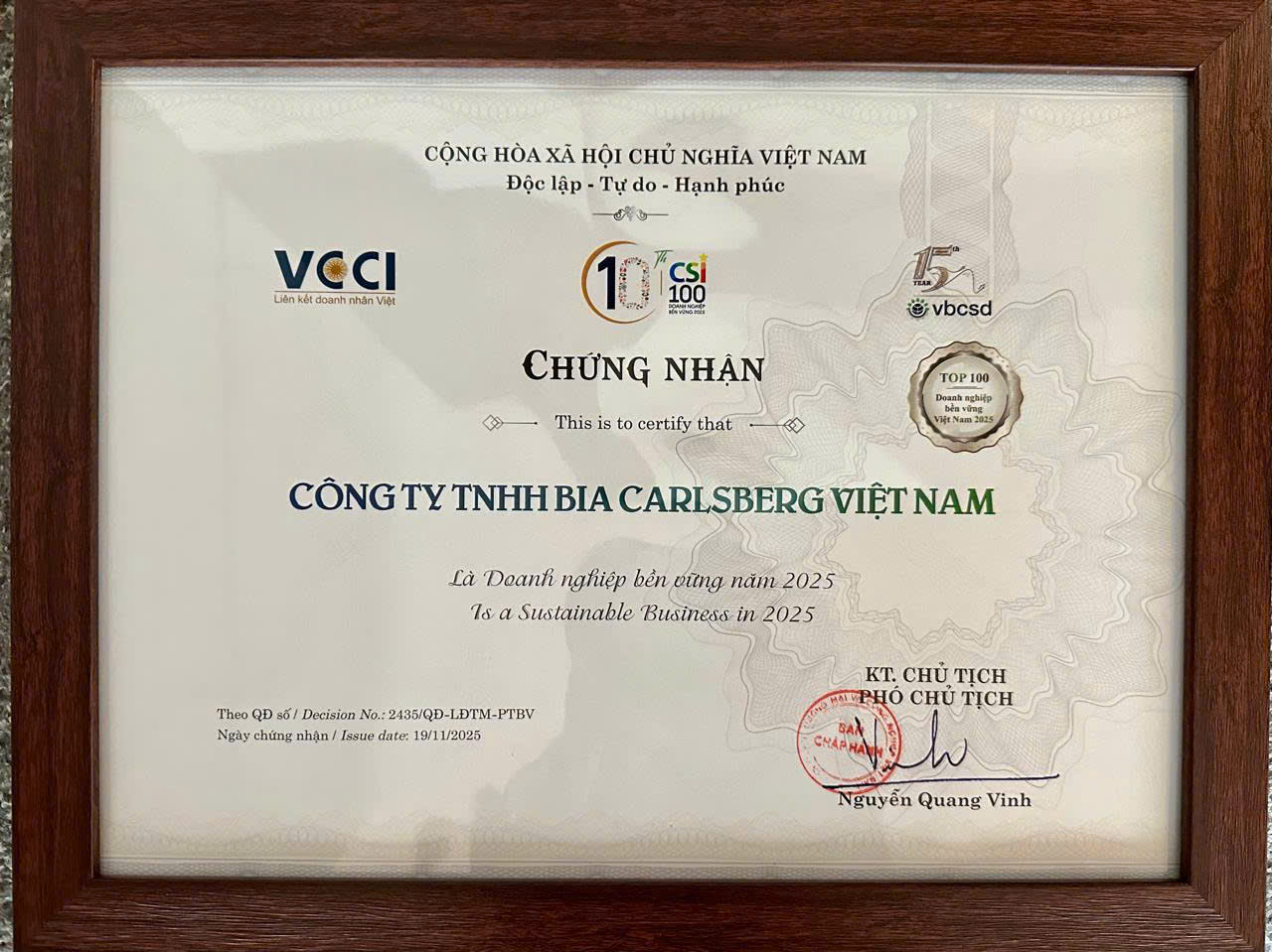 Carlsberg Việt Nam vừa được vinh danh trong Top 100 doanh nghiệp bền vững nhất Việt Nam (thuộc lĩnh vực thương mại – dịch vụ) tại Lễ trao giải chương trình đánh giá và xếp hạng các doanh nghiệp bền vững Việt Nam (CSI) 2025 diễn ra vào ngày 5/12/2025 tại Hà Nội.